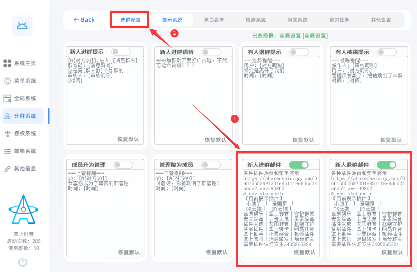 6.填好之后返回选群配置,绿色就是这个群开启