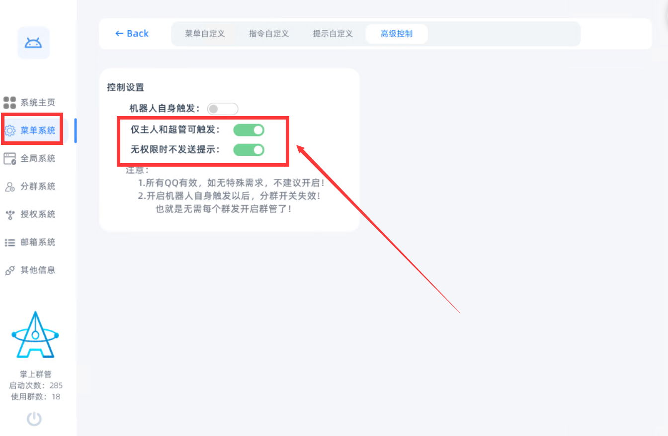 1.进入后台配置主人号,如果你只用邮箱的话建议加上前缀,这样别人不容易触发你的机器人