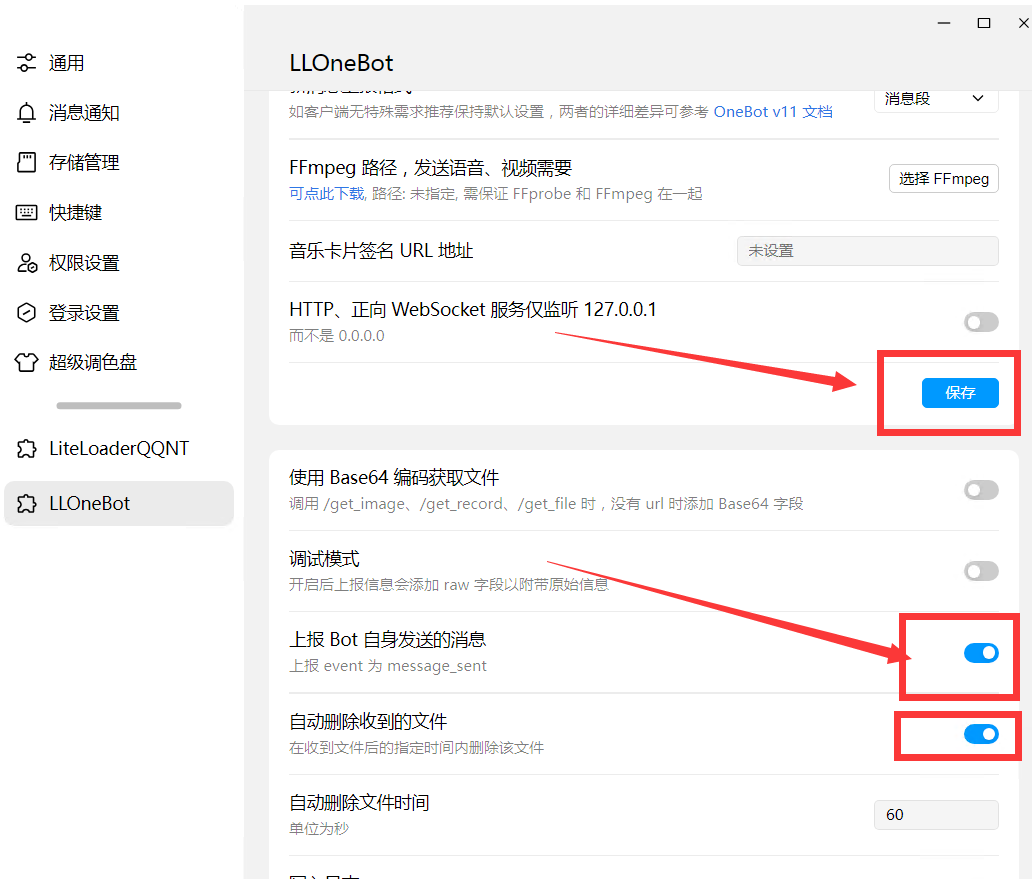 1.2点击LLOneBot,把图中的两个打开,其他的全部关掉,下面监听地址填写