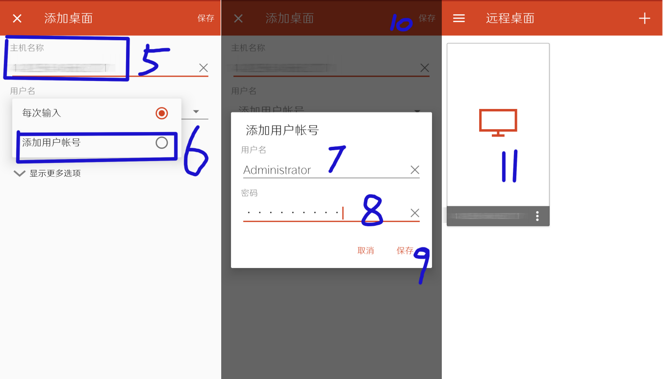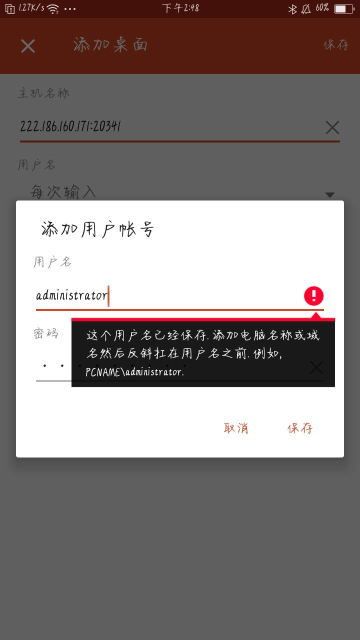 3.  填用户名,基本所有挂机宝的 登录用户名都是administrator ,填进去点保存,然后点连接即可(看不懂就百度吧)