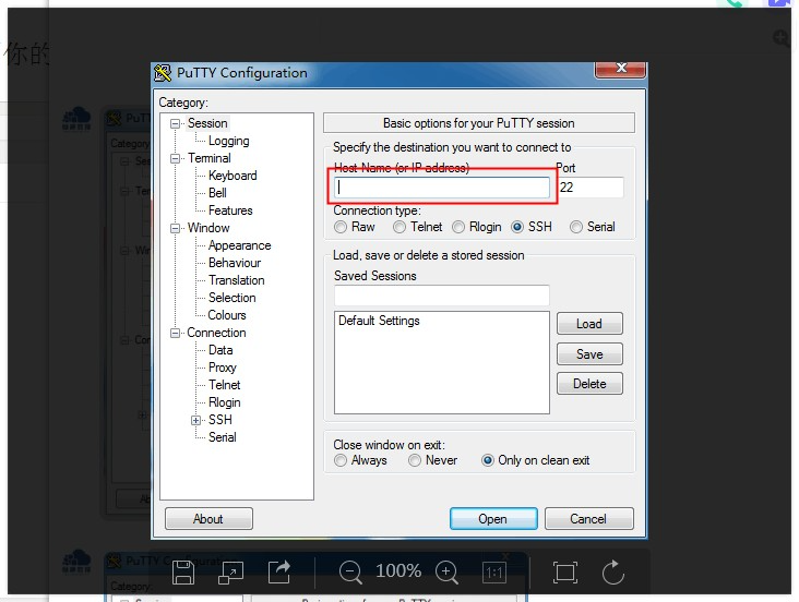 1、  打开PuTTY,在红色区域输入公网IP,端口默认是22,