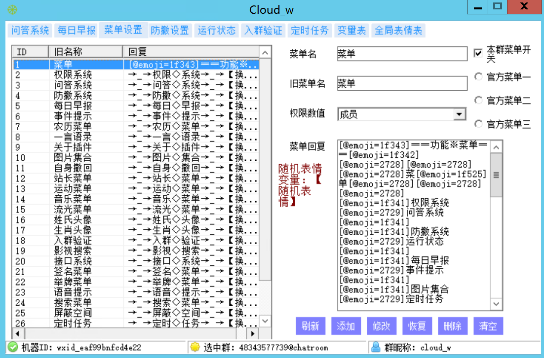 4.选择需要使用的群,选择菜单设置,恢复默认菜单和打开菜单开关